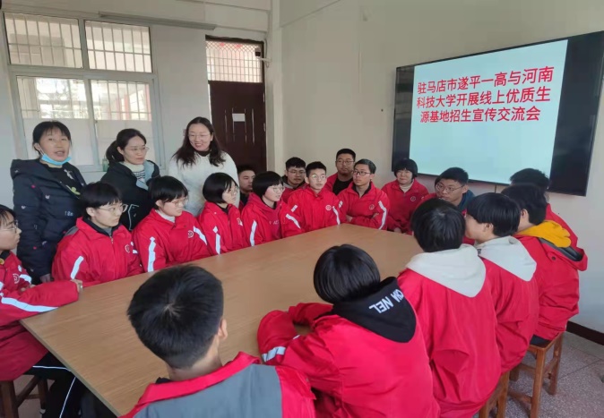 12月1日上午11:30,我院与遂平一高开展线上招生宣传。遂平一高督导室主任李文义、班主任张桂芳、王俊杨、刘双老师及有意向报考我校的20余名优秀学生代表参加了此次交流会。