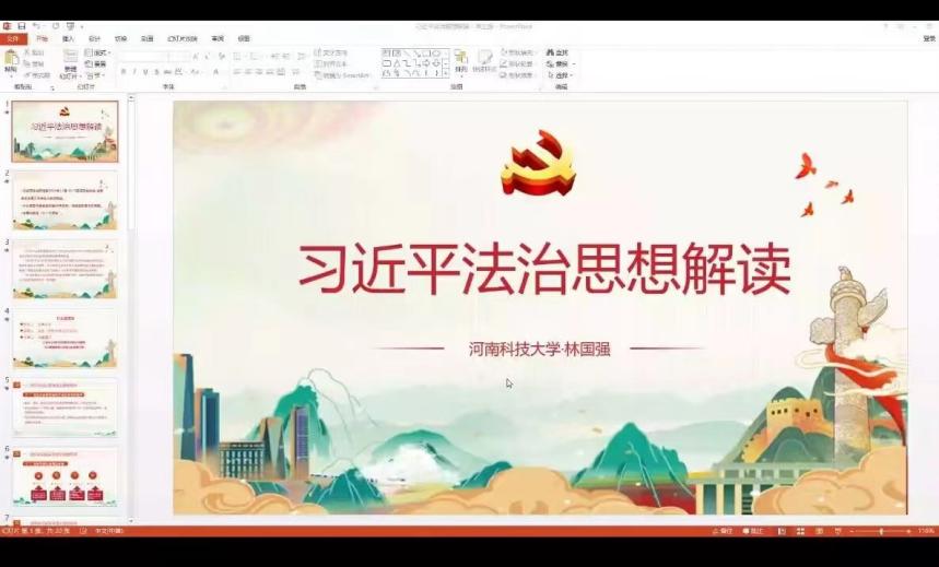 首先,主持人张老师对林国强老师进行了介绍,并介绍此次讲座的主题为《习近平法治思想解读》。然后,林老师开始本次讲座,他分别从形式、实质、效果阐述什么是法治,引导学生对法治有一个基本的了解。然后,林老师从三个方面更进一步讲解法治:一是坚持党对全面依法治国的领导;二是坚持依宪治国,依宪执政;三是坚持全面推进科学立法、严格执法、公正司法、全民守法。最后,林老师以了解法律知识,遵守法律规则,使用法律维权,积淀法律素养作为结语结束本次专题讲座。