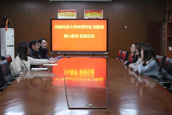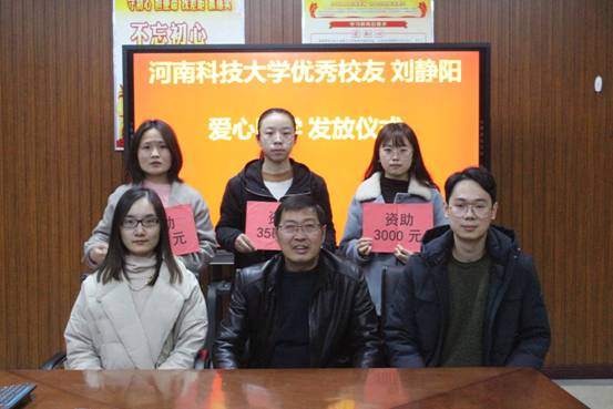 首先,马院长对我院优秀校友刘静阳总经理的情况进行介绍,刘静阳校友自毕业参加工作以来,一直关心母校和学院的发展,从自己的收入中拿出一部分作为助学金,对我院品学兼优且家庭经济困难的学生进行资助,表现出了她对母校的深厚感情和对师弟师妹们的无私关爱,学院对她的爱心助学活动表示衷心的感谢。然后,马院长代刘静阳总经理为三位受资助的学生发放助学金。最后,受资助学生汇报了自己的学习、生活情况,并表达了感激之情和努力学习的决心。