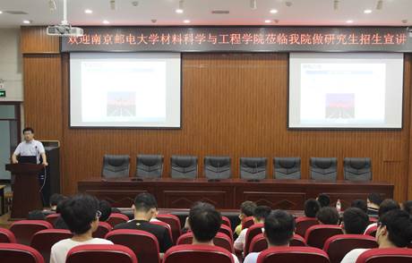 、师资队伍、人才团队,研究所、研究方向、研究成果、学科平台以及合作交流等情况进行了详细的介绍,同时也介绍了研究生在校生活、就业前景等。最后,已考上南京邮电大学材料科学与工程学院研究生的学生代表——化工172班杨雅凤同学和同学们分享了她选择报考南京邮电大学的原因和备考经验,鼓励更多考研的同学积极报考南京邮电大学。