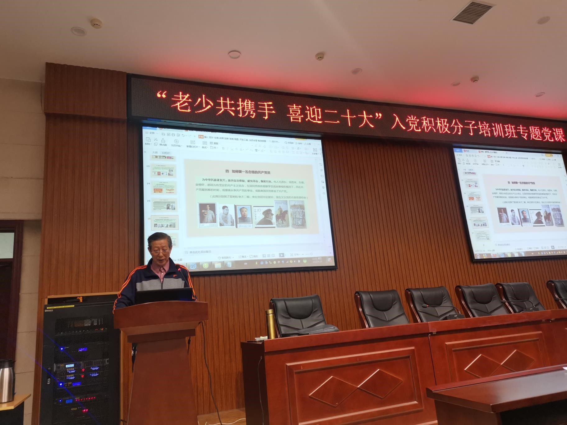 为深入学习贯彻习近平新时代中国特色社会主义思想,迎接党的二十大,4月29日,化工与制药学院于工科五-211开展“老少共携手 喜迎二十大”入党积极分子培训班专题党课活动。学院邀请到校关工委宣讲团任章留为入党积极分子讲授专题党课,院党委副书记马东辉主持, 21级辅导员张俊和ACG导航